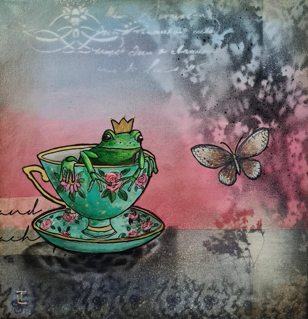 Ibland uppstår de mest magiska konstverken när fantasin får ta ledningen. En groda med krona i en kopp är ett sådant motiv – oväntat, humoristiskt och charmigt, men samtidigt fyllt av symbolik. Det är en bild som väcker nyfikenhet, får betraktaren att le och bjuder in till tolkning.