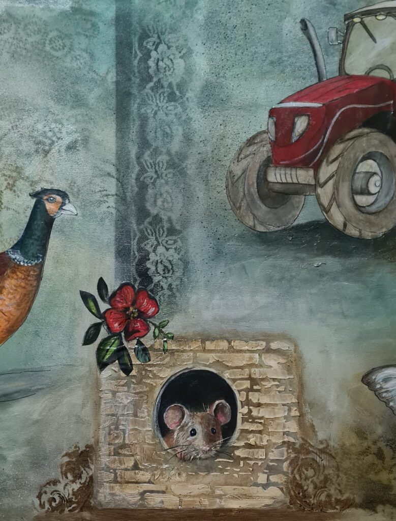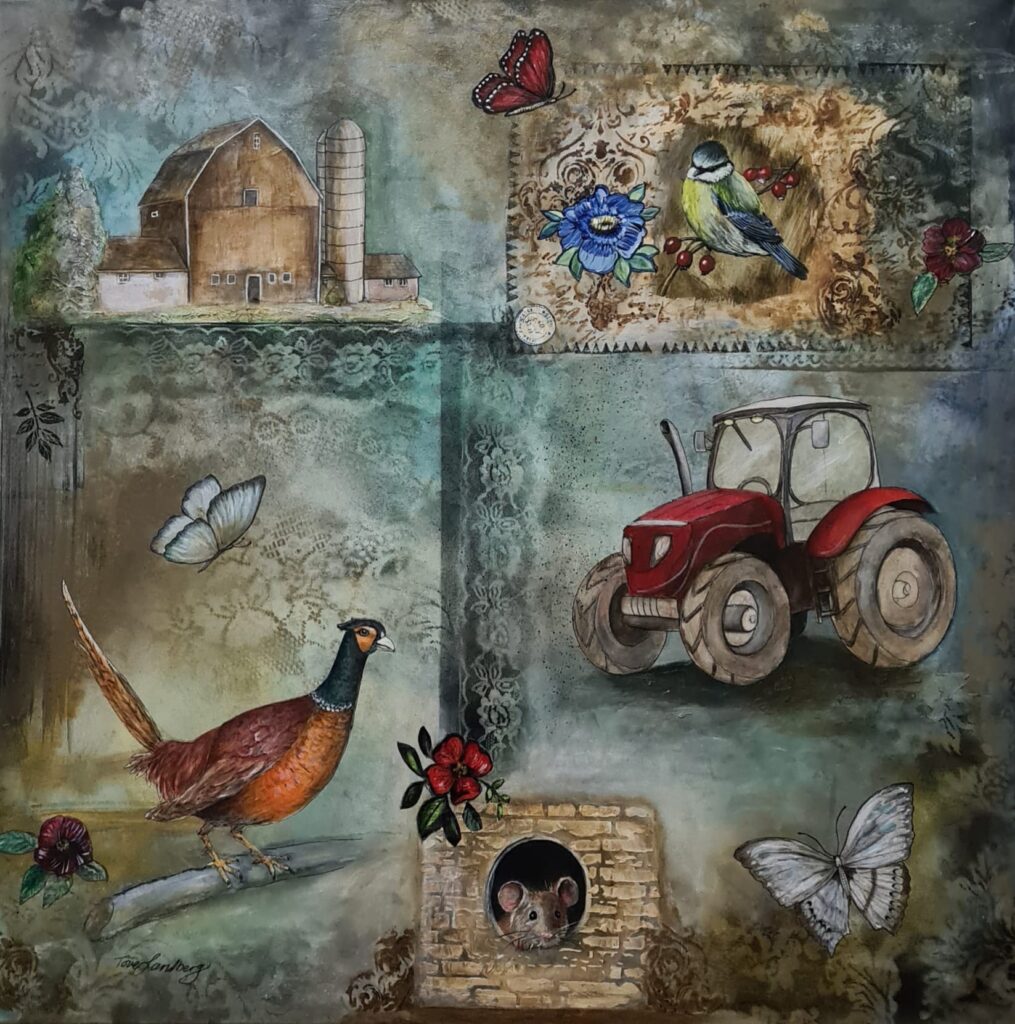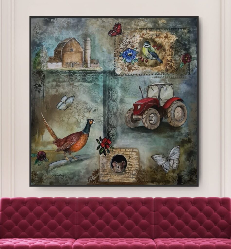 Man ser en traktor, en mus och allt som rör en bondgård lång ute på landet. Eller ett slott någonstans i Sverige! Har man en tavla med många detaljer så behöver man inte inreda rummet med massor av nya detaljer. Det ska också synas var för sig och inte klumpas ihop med för mycket inredning.