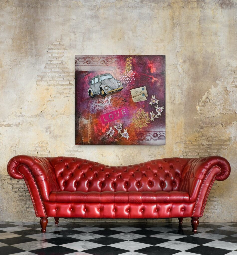 Ännu en chesterfield soffa fast denna gång i sammet och brun gör sig också utmärkt på bild med tavlan ovan. Denna tavla gör sig också utmärkt i ett helt vitt rum med få detaljer som nedan soffa. Det går att placera den överallt beroende på tycke och smak.